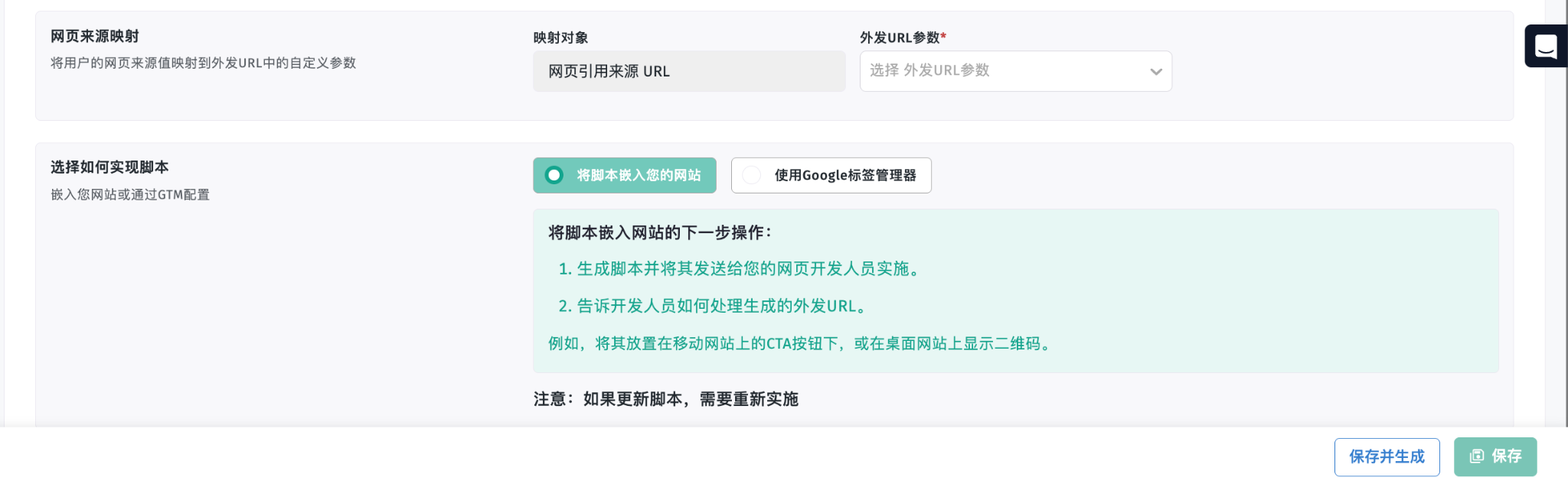 如果你选择将 Smart Script 直接嵌入网站,需要与你的网站开发团队协调,确保脚本被正确放置和执行。该方式允许 Smart Script 根据你在 Apptrove 中设置的 URL 参数映射动态调整并生成传出链接。此方法适用于未使用 GTM 的自定义场景,能在网站代码中实现对脚本行为的完全控制。